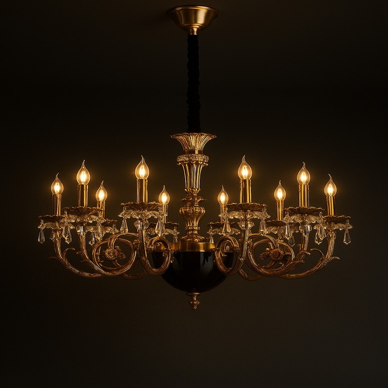 Crafted with intricate detailing on the central column and bowl, this chandelier becomes the centerpiece of any room it graces. The contrasting black-and-gold elements add depth and richness to the design, making it ideal for vintage-inspired interiors, luxury villas, high-end hotels, or banquet spaces.