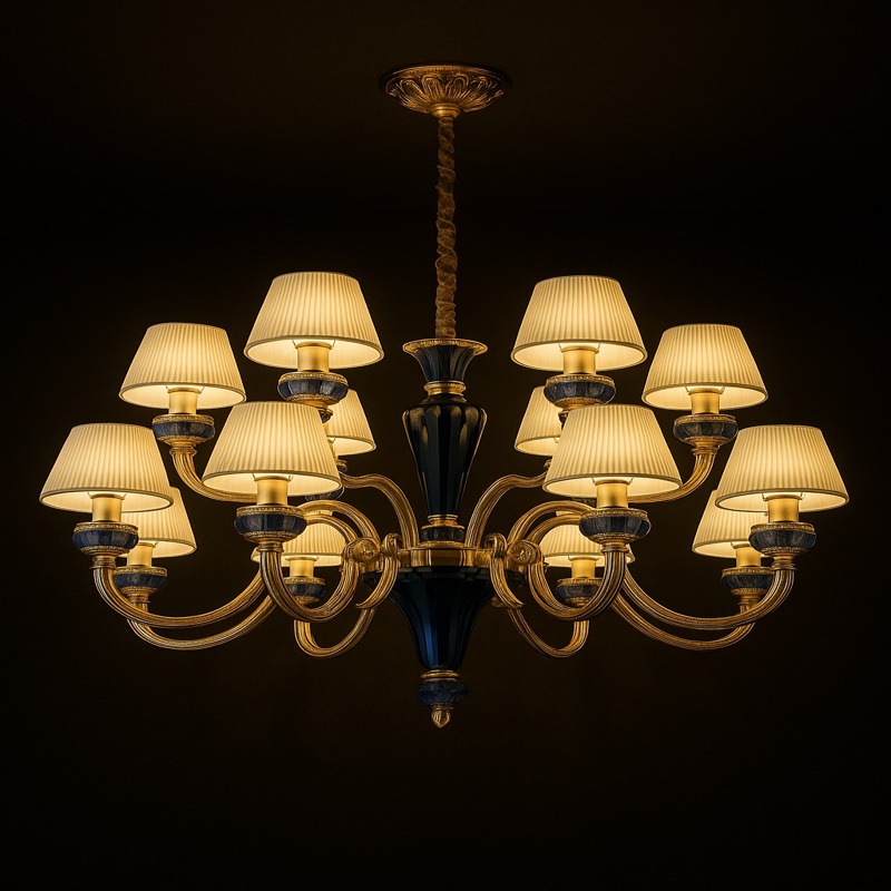 The dual-tone body in brushed gold and midnight black offers a bold contrast, while the pleated fabric lampshades cast a soft, warm glow — perfect for creating an opulent atmosphere in dining rooms, hotel lobbies, banquet halls, or luxurious homes.