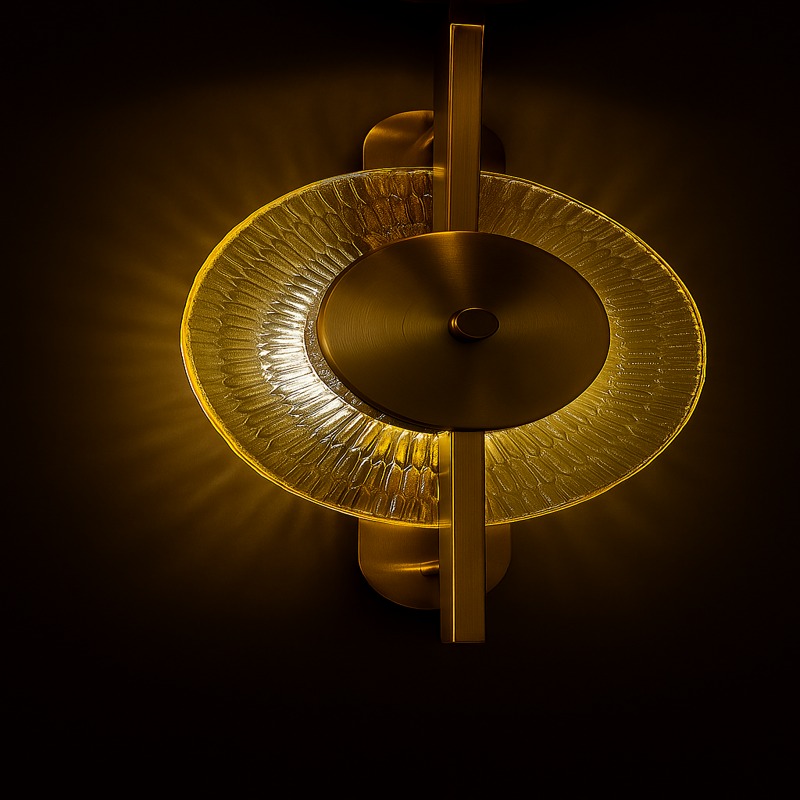 Introducing Solare Disc — a breathtaking fusion of glass and gold, crafted for those who appreciate fine detail and bold elegance. The centerpiece of this wall light is a clear textured crystal disc that refracts light into delicate rays, creating a warm, radiant glow.